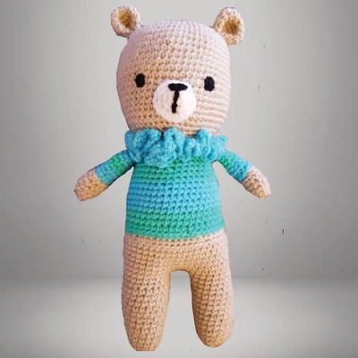 Ourson beige avec son pull vert et bleu, en laine lavable à 30 degrés, de préférence à la main.